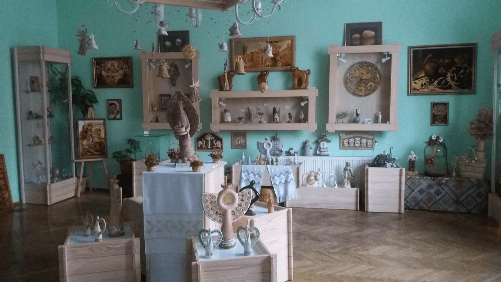В іншій експозиційній кімнаті продемонстровані витвори мистецтва, виготовлені з використанням бурштину: